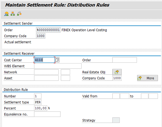Now that I have calculated costs for each operation, the next element to consider is how to settle the costs. To generate the settlement rule, choose Order > Functions > Generate Settlement Rule. This results in the status SETC (settlement rule created) being set for the operation. To display the settlement rule, choose GoTo > Settlement Rule. Figure 10 shows the settlement rule for the settlement of the costs on the first operation. In this case, I am settling the costs back to the cost center for the equipment being maintained. Again, the default is that the settlement rule for the header is copied to the assigned operations, but you might want to manipulate this logic using the BADI BADI_OLC_SETTL_RULE_DET_OPR. When you are happy with the maintenance order, release it by choosing Order > Functions > Release and save by choosing Order > Save.