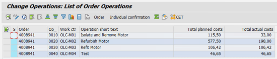 You find the new fields for the operation in reports, such as transaction IW40N (Operation Cost Overview), as shown in Figure 12. You saw this report earlier, but now you have performed the confirmations and can see the actual costs alongside the planned costs for each operation.