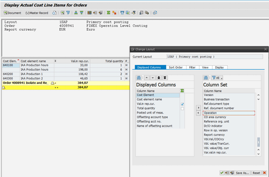 Finally, in CO the new field for the operation is available in transaction KOB1 (display order line items), but you may need to change your display layouts to include it. In Figure 14 I’ve started to display the costs with the standard layout 1SAP (Primary Cost Posting) and then accessed the complete field catalog by choosing Change Layout. I’ve scrolled down to the Operation field to move it into the list of Displayed Columns.