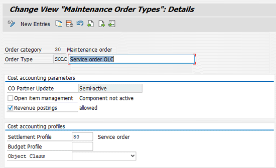 Check that the order types that you use for your service orders allow revenue postings. Follow IMG menu path Plant Maintenance and Customer Service > Maintenance and Service Processing > Maintenance and Service Orders > Functions and Settings for Order Types > Configure Order Types. Figure 3 shows the settings for the order type SOLC, which allows Revenue postings. In Figure 3, you also notice the settings for the Settlement Profile and the Budget Profile. I discuss these settings later.