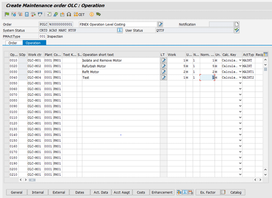 Operations (i.e., tasks performed as part of an order) structure the maintenance and service tasks to be performed within an order. They specify the planned time to complete the task, any spare parts needed, and whether the operation is performed internally or externally. Where the difference in costs between the various operations on an order is significant, there is a need to be more accurate in the cost assignment.