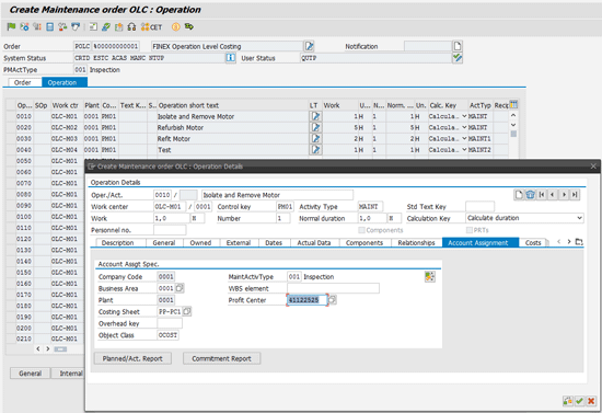 Figure 7 shows the Account Assignment Details for the first operation. Notice that many of the organizational assignments that you usually find at the header level are now at the operation level. Although the company code and plant are clearly the same for each operation in the order, you can select the other parameters (profit center, business area, functional area, object class, costing sheet) whether you simply copy the parameters from the order header or use the Business Add-In (BAdI) BADI ES_EAM_OAA_DEFAULT to change this assignment to meet your needs. You might, for example, decide to take a different approach to overhead calculation for some operation types, and so you need to configure the costing sheet assignment to reflect this approach.