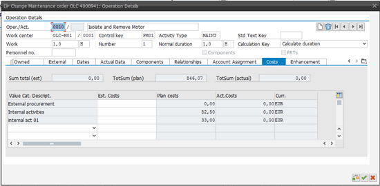 As external and internal reporting requirements have become more stringent, maintenance costs are under increased scrutiny. Therefore, businesses sometimes need to analyze the costs for each operation separately. For this reason, you can now choose whether you assign costs at the order header level or at operation level.
