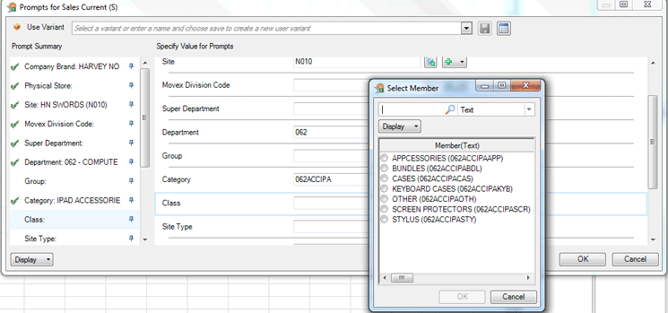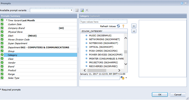 The functionality works in a similar way across multiple BI tools, via a Prompts screen and variable selection. Figure 1 shows a filtered list of values of categories, by site and department for Web Intelligence.