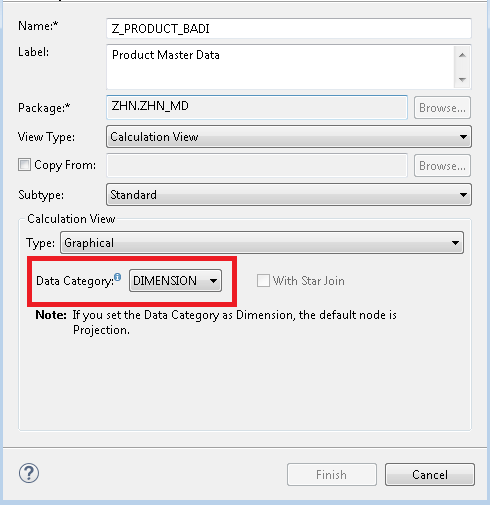 Launch SAP HANA studio and select the SAP HANA modeler. In the screen that opens (Figure 5), create a new standard graphical calculation view. In this example, I call it Z_PRODUCT_BADI. Select the Data Category as DIMENSION (highlighted in red). Click the Finish button, which takes you to Figure 6.