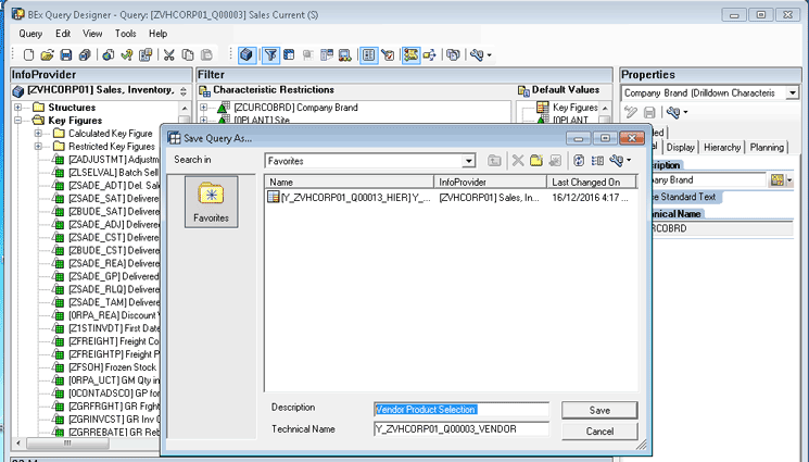 In the next few steps I create a join between two master data tables in SAP BW and select a number of attributes of the master data objects that are used as filters in the user prompts. For example, this master data object could be the site, vendor, or brand of a particular product.