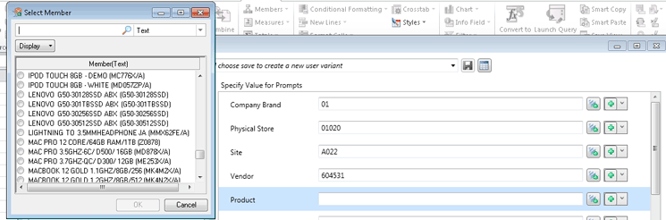 The view is filtered by Company Brand 01, Store 01020, Site A022, and Vendor 604531. When you select the product variable, you can now see a filtered list of specific products that have been sold from the selection made in the prompt screen. Previously, in Figure 37, this would display every product and exceed the maximum number allowed for F4 Help values.