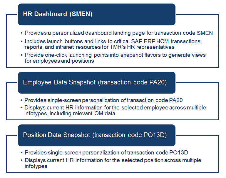 TMR is a long-time SAP customer, implementing SAP ERP HCM back in 1996. While an upgrade from SAP ERP Central Component (ECC) 4.6c to SAP ECC 6.0 in 2014 provided more employee- and manager-self-service (ESS/MSS) capabilities, TMR’s SAP ERP HCM system was focused only on the Personnel Administration (PA), Organizational Management (OM), and Payroll/Time applications. In early 2015, TMR moved forward with an SAP ERP HCM improvement project with the goals of evaluating and revitalizing the current system and services provided to HR professional users and employees alike.