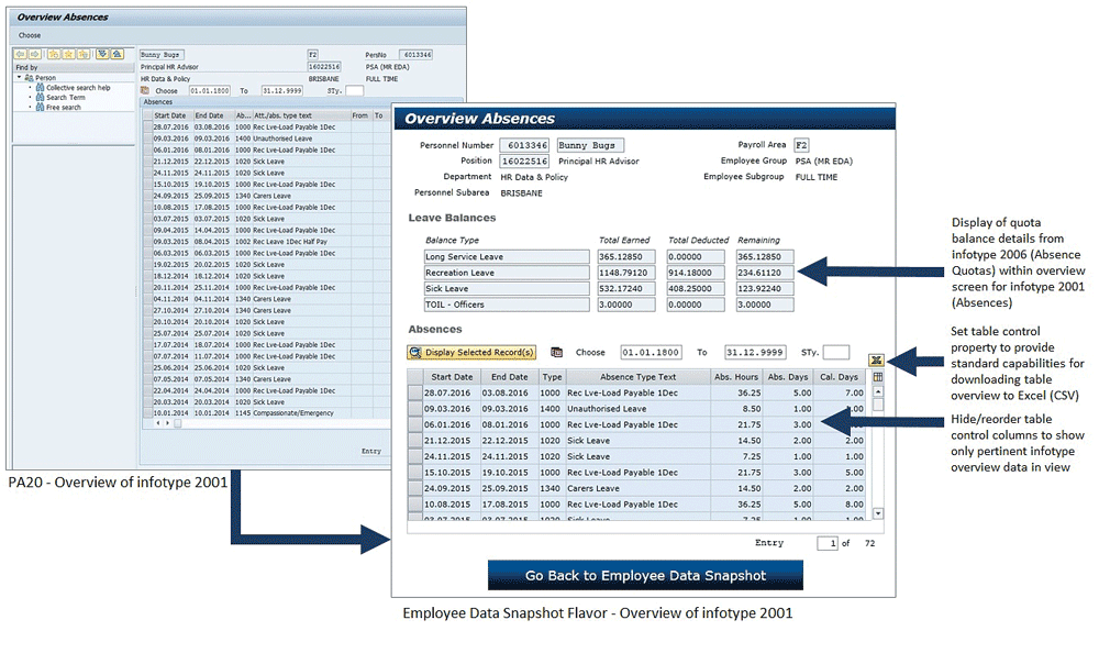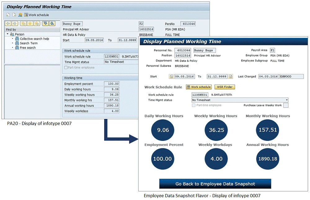 Figure 10 Standard transaction code PA20 view vs. the Employee Data Snapshot flavor for TMR