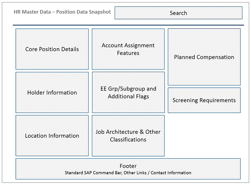 The Position Data Snapshot flavor, built on top of transaction code PO13D, is designed in a similar manner to the Employee Data Snapshot. This flavor was designed to provide HR representatives with a snapshot of critical HR master data for a position, primarily focused on OM infotype data related to a position. The ability to perform common display and overview actions found in transaction code PO13D (similar to transaction code PA20 previously) were included in the flavor. Figure 11 represents an initial wireframe layout of TMR’s Position Data Snapshot from the blueprint-design phase in the project.