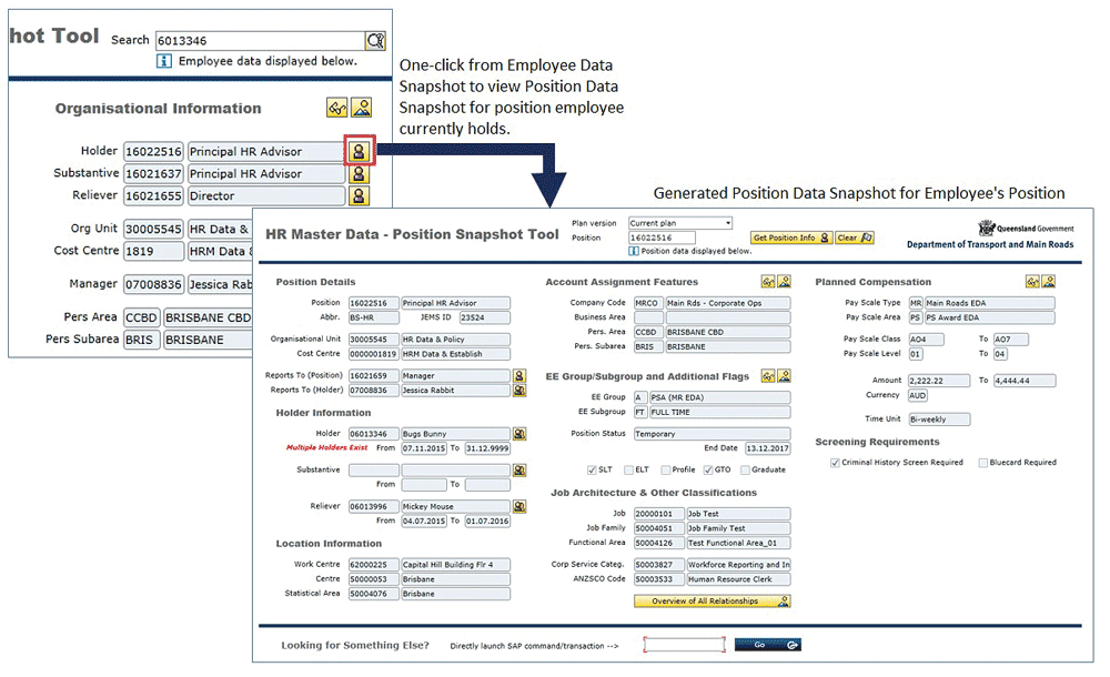 Users can click the corresponding display and overview icons in the different sections of the Position Data Snapshot to view the typical infotype display and overview screens found in transaction code PO13D. Other icons are provided in the Position Data Snapshot, as well as the Employee Data Snapshot, that facilitate tight integration between these two SAP Screen Personas flavors. Users can click these icons to generate the respective snapshot (e.g., Employee Data or Position Data) for the employee or position referenced in the field next to the icon. This allows an HR user to regenerate a snapshot for a manager (as noted in the snapshot data) with one click, or to view an employee’s position detail in the Position Detail Snapshot in one click from the Employee Data Snapshot (as shown in Figure 13). The functionality provided by these icons weds these two flavors together, providing an enhanced user experience across the two snapshots.