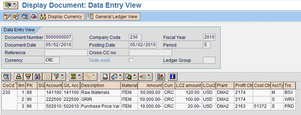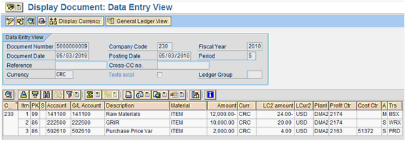 The accounting document for goods receipt reversal is shown in Figure 16. A comparison with Figure 12 shows how postings in the original goods receipt have been reversed. You see that the postings to the inventory, GR/IR, and purchase price variance have the debit and credits reversed to nullify the financial impact to all these accounts.