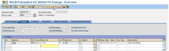 You can carry out the stock transport returns order with the same flow as the STO process by imagining that you are sending a negative quantity of the material.