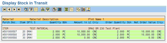 A standard SAP report valuates the in-transit inventory that can be displayed in transaction MB5T. The in-transit inventory is valuated at the purchase order price in the returns line. In Figure 17, there were two return lines in purchase order 4501000588 with the prices $10 and $0, respectively.