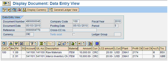 At this point, the material is in transit. Imagine this as the material being transferred in a ship from the US to Costa Rica. From an accounting standpoint, the materials were removed from the books of legal entity 100 the instant you posted the goods issue. However, you must valuate the material in this shipment, which was shipped out sometime close to month end, and bring it to your accounting books as a month-end valuation activity.