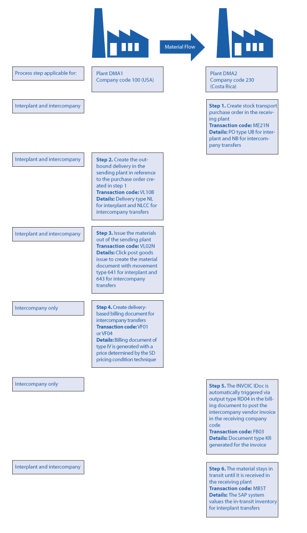 I am using plant DMA1 in company code 100 (USA) as the supplying plant and plant DMA2 in company code 230 (Costa Rica) as the receiving plant. Figure 1 displays the material flow.