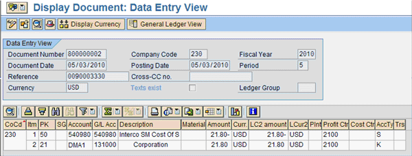 Accounting documents for billing and vendor invoices are tied to each other by the billing document number in the Reference field. The financial posting for the billing document and the internal vendor invoice are shown in Figures 9 and 10.