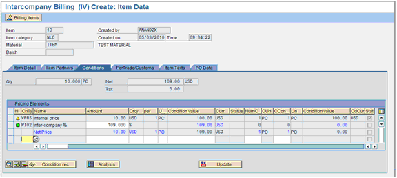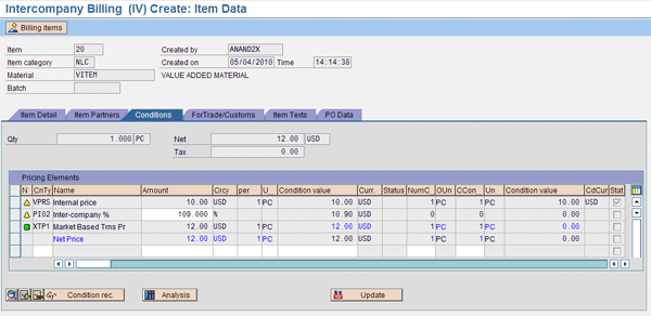 Figure 7 shows the billing document created from the outbound delivery. Select the line item and click the item pricing condition icon to get the details of how the transfer price was calculated (Figure 7). You can see that condition type VPRS picked the standard price of $10 of material ITEM in sending plant DMA1. The condition type PI02 has marked up the price by 9% over the cost of material as reflected in its standard price. For more about one condition type, called the statistical condition type, see the sidebar “Identify the Statistical Condition.”