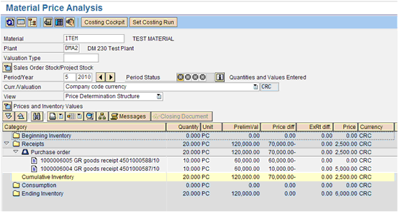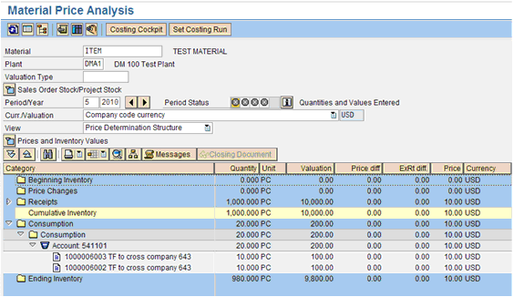 B, which you display using transaction CKM3N (material price analysis), are applicable if the sending and receiving plants use the material ledger. The SAP system treats the goods issue from the sending plant for an intercompany STO as consumption and treats the goods receipt in the receiving plant as a purchase from any vendor. The value that is transferred to the receiving plant’s legal entity purely depends on the price in the purchase order. The price column for row GR for purchase order 4501000588 in