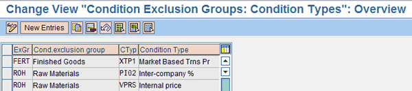 You can maintain condition exclusion by following menu path Customizing > Sales and Distribution > Basic Functions > Pricing > Condition Exclusion. An exclusion group, as shown in Figure B, is a group of condition types that is compared with other groups during pricing. It results in the exclusion of an entire group.