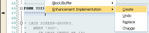 Step 3. Right-click the enhancement point line in the code and follow menu path Enhancement Implementation > Create (Figure 65).