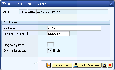 Step 6. In the next screen, enter the name in the Package field (e.g., ZFSL) of the package in which you want to save this enhancement. Click the save icon. Place this object in the same request created in Figure 16.