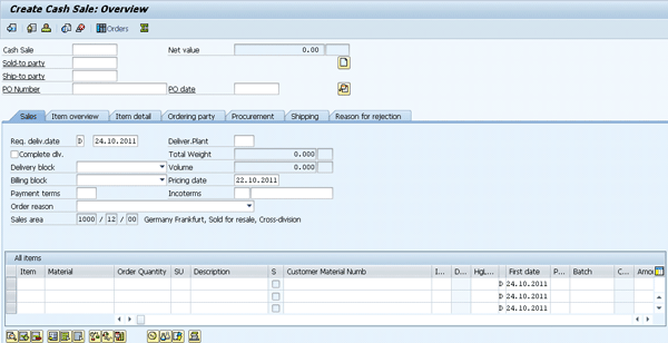 The initial screen for creating a sales order