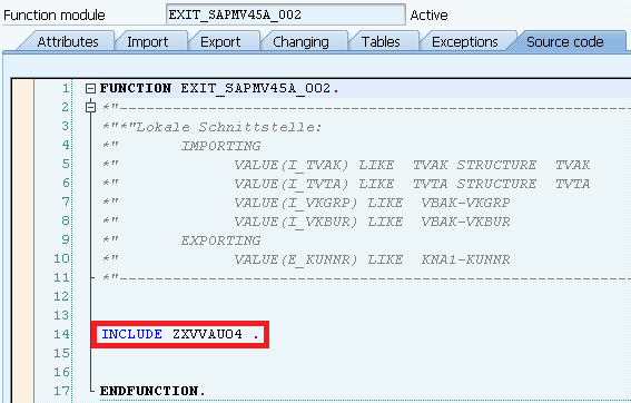 Select the function module name EXIT_SAPMV45A_002