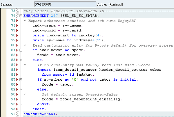 Step 8. Add code to the enhancement. Now you can see lines of code inside ENHANCEMENT 247 ZFSL_SD_SO_SDTAB … ENDENHANCEMENT (Figure 69). Enter your code after endif on line 93.