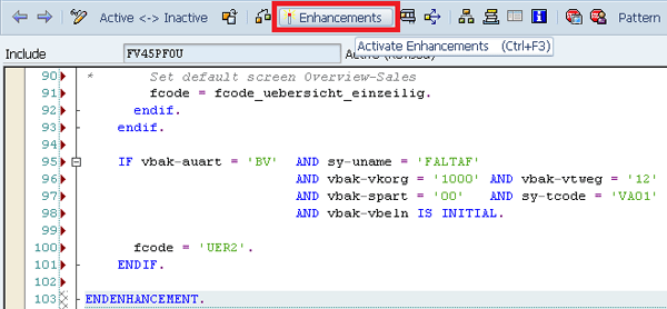 Step 9. Add code at the end of existing code and activate the enhancement using the Enhancements button on the toolbar (Figure 70).