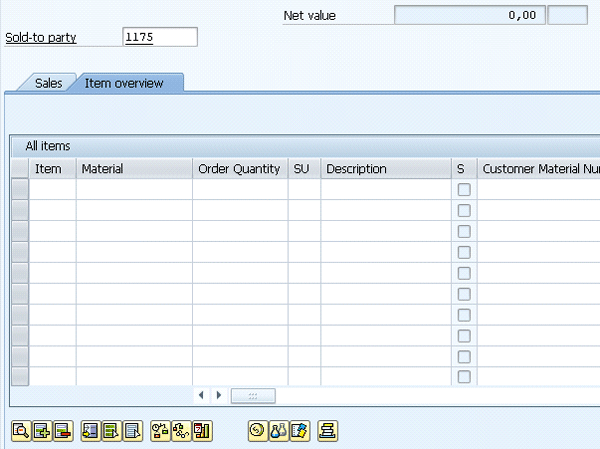 Now you are ready to test the changes. Use transaction code VA01 again. You can see that the main screen now only has two fields on the header: Sold-to party and Net value (Figure 23). There is also no field on the Sales tab (Figure 23) or on the Item overview tab (Figure 24).