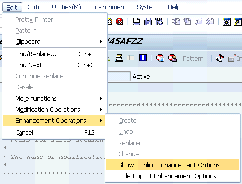 Step 3. Create the enhancement implementation. Right-click the enhancement point line in the code and follow menu path Enhancement Implementation > Create in the context menu (Figure 43).