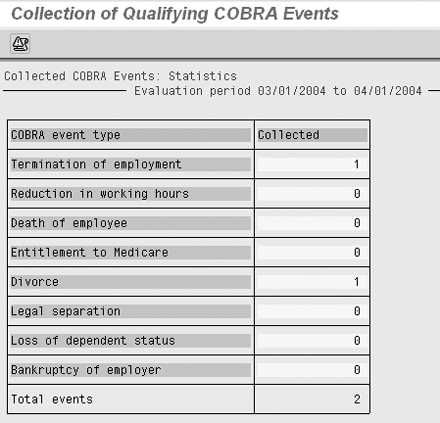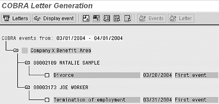 The top half of Figure 3 is a diagram of how the COBRA event collection process works. Someone in the benefits department runs the COBRA event collection program at the end of each week. The program uses the COBRA configuration as a guide when searching the master data for qualified events. It is good practice to use an event selection period that covers the most recently passed two or three months. The large selection window allows for the possibility of back-dated changes such as the divorce that was effective on March 20 but not entered until mid-April. The event collection program checks the COBRA buffer and the list of COBRA beneficiaries to ensure that each event is collected only once. Figure 4 shows the output of the COBRA event collection process for two events.