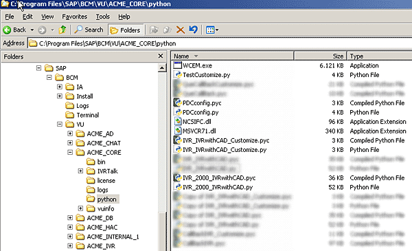 After creating all necessary states, verify and activate your application to the SAP Business Communications Management database. Follow menu path File > Verify, and if no errors are displayed, follow menu path File > Activate. (For more help in this area, refer to the installation documentation, “Business Communications Management IVR Administrator – Administration Guide, cap. 3.6.”) The main Python script output file is automatically generated and recorded at your Python directory, where you also must record the customized Python file used by custom state 120 (e.g., C:Program FilesSAPBusiness Communications ManagementVUACME_COREPython) as shown in Figure 10.