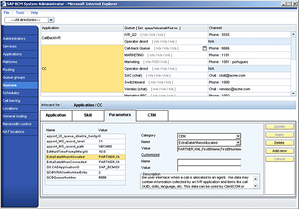 Click the parameters tab halfway down the screen (Figure 12). You need to add the following extra parameters to the application type CALLCENTER, in which queues and agents are added indicating whether additional data is sent to an agent when a call is connected from the IVR. Set the values PARTNER (related to the index set in External Data Array), XML (the format used), and FirstBName and FirstBNumber (name and number of queue in SAP Business Communications Management that call was forwarded to, which is an optional parameter).