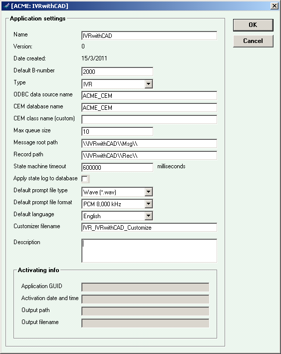 - Name. This is the name of your IVR application. The application will be added to the contact event manager (CEM) database. You can manage this application later in the SAP Business Communications Management system administrator.