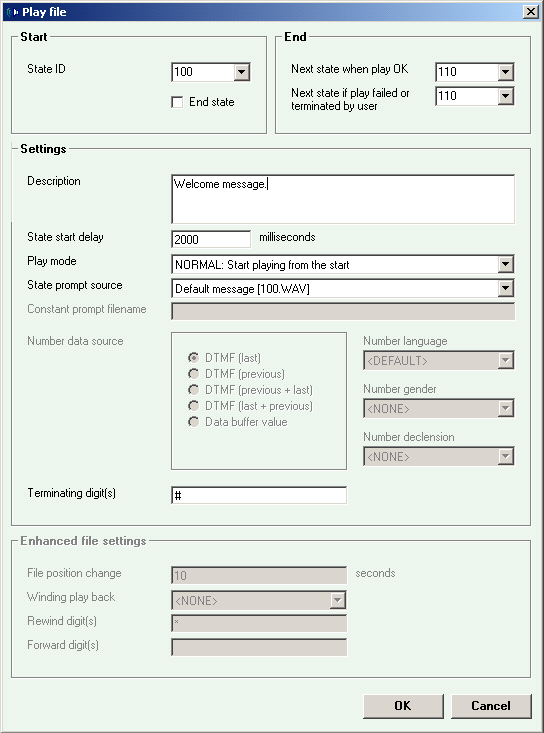 Set the state start delay with the desired time that you want the first message to play, which is useful to avoid the initial message starting too soon while the call is being connected. Usually two or three seconds is long enough (i.e., 2,000 or 3,000 milliseconds, the time unit shown on the screen). Set the Play mode to NORMAL: Start playing from the start (Figure 4). Record and store a welcome message in the path indicated in the application screen, and name it as indicated in the State prompt source field (e.g., 100.WAV). Click OK to add this first state.