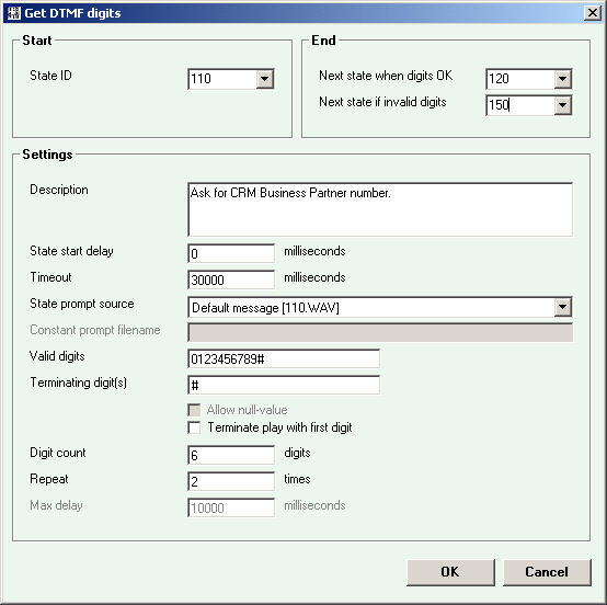 - State 110 GET DIGITS plays a message asking for a business partner number and stores this data into a variable. It also defines the number of the alternative state to go to if GET DIGITS fails, the defined maximum number of repeats is achieved, or the received dual-tone multifrequency digit string is invalid.