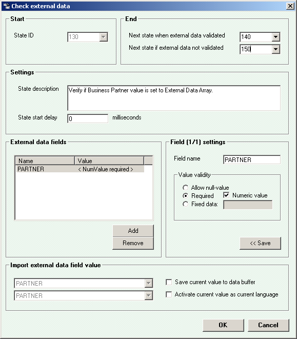 Next, in the IVR administrator, follow menu path Edit > Insert new state > Check external data (Figure 7). This state is responsible for checking if an index PARTNER and a numeric Value are set to External Data Array correctly. Fill in field Name with the value PARTNER, set Value validity to Required, and select the Numeric value box to check if the assignment of the business partner to External Data Array was successful (this is an optional state). Click Save (the field name appears on left side inside External data fields area), and then click OK.
