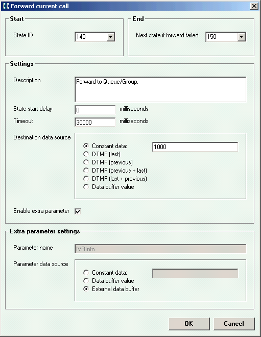 In the IVR administrator follow menu path Edit > Insert new state > Forward call. This state forwards the call to a queue for human handling, along with the data collected from the customer so far, which will be used by SAP CRM for automatic customer identification. Set the Destination data source to Constant data and enter the queue number (channel) in which agents are logged in and are waiting for customer calls. Check the Enable extra parameter box and set Parameter data source to External data buffer to send contact-attached data (CAD) with the call (Figure 8). Click OK.