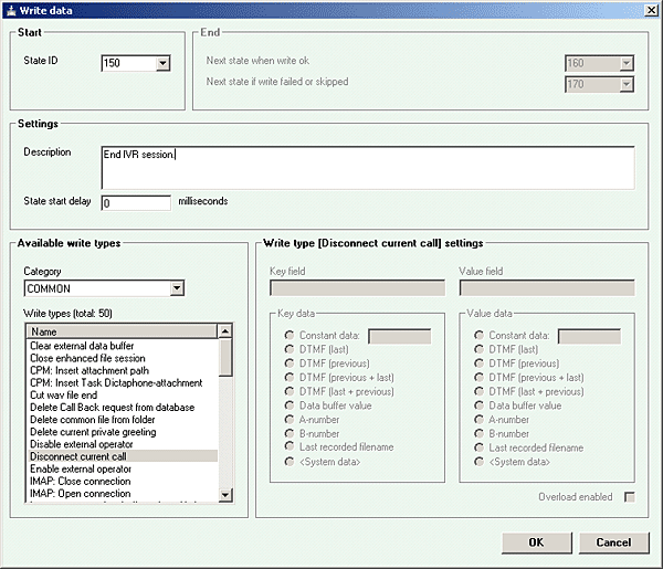 Next, in the IVR administrator, follow menu path Edit > Insert new state > Write CEM data. This state is responsible for updating SAP Business Communications Management databases, and disconnects the current session from the IVR after forwarding it. Set Category to COMMON and select the Name Disconnect current call to end the IVR session (Figure 9). Click OK.