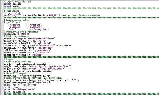 To send REST requests from Python code, you need to import the urllib2 library. The Python Editor uses Python version 2.6.2, and urllib2 is the only library for REST requests in this version. SAP BusinessObjects RESTful Web Services support both XML and JavaScript Object Notation (JSON) requests and response formats. In this example, we use JSON because it’s more convenient to use with Python. Therefore, an import of that JSON library is needed.
