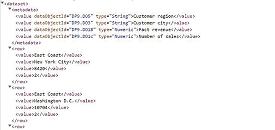 Figure 9) consists of two underlying nodes: metadata and row (i.e., data). Either of these nodes contains the value node for each column in the table. Metadata value nodes describe columns (e.g., dataObjectId, data type, and column name). Row value nodes contain data for each row. All value nodes are placed respective to the column order in the table and have the same index.