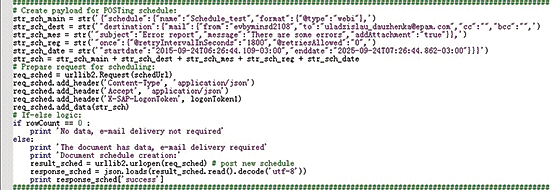 Figure 2, we transfer one value from RowGeneration (RG_Scheduling) as the source, to the table type (TT_Scheduling) as the target, via a UDT (transformations).This is because we are only scheduling one document and its ID is easier to set as a constant in the Python code of a UDT. If you need more than one document to be scheduled, you can use a database table or a flat file with the document’s ID list as the source. In that case, all other operations are repeated for each document in the list. There is no transformation in Q_Scheduling, but in this case we use it as a connection link between RG and a UDT according to SAP best practices. This approach is widely used in BODS jobs. RG_Scheduling is used for starting the dataflow, Q_Scheduling is used to pass the parameters, all logic is implemented in UDT_Scheduling, and TT_Scheduling is used as the finishing element.