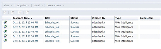 You can check scheduled documents’ instances in the documents’ history in the BI Launch Pad by right-clicking the instance and selecting History from the context menu that opens (not shown). This opens a screen like the one in