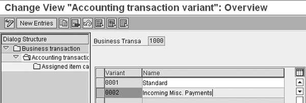 - Business transaction variant: This is a specific version of the predefined business transaction provided by SAP and the modeling of a real business pro- cess for document splitting. An example is variant 0001, which represents Standard for payments. You have to assign every document type that you use to a single combination of a business transaction and a variant.