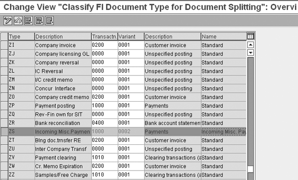 Step 2. Classify document types for document splitting. The system analyzes every business transaction that you enter during the document splitting process. In this process, the system determines which splitting rule it applies to the document. So that the system can determine the splitting rule, you must assign a business transaction variant to each document type. In my example, the system assigns document type ZS for an incoming miscellaneous payment to business transaction 1000 and the new business transaction variant 0002 for Incoming Misc. Payments (Figure 4). To classify document types for document splitting, follow menu path IMG > Financial Accounting (New) > General Ledger Accounting (New) > Business Transactions > Document Splitting > Classify Document Types for Document Splitting.