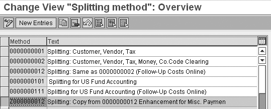 Step 3. Define the document splitting method. Before you can define any new splitting rule, you have to define a new document splitting method. SAP recommends that you copy the delivered settings to the splitting method that you define and then make changes to those settings. In my example, the system copies splitting method Z000000012 from standard method 0000000012 (Figure 5). To define the document splitting method, follow menu path IMG > Financial Accounting (New) > General Ledger Accounting (New) > Business Transactions > Document Splitting > Extended Document Splitting > Define Document Splitting Method.