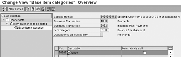 Next, you need to define the item category that you’re splitting. In my example, you add item category 01000 (Balance Sheet Account) (Figure 7). You can reach the screen by navigating through the tree on the left side of the screen.
