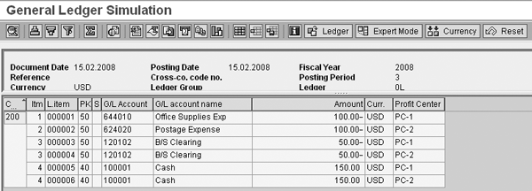 In this example, the expense accounts serve as base item categories. To correctly split the balance sheet line item with the appropriate profit center assignment, the balance sheet clearing account needs a rule to derive a profit center from the expense line items. The new G/L view of this posting is shown in Table 2.